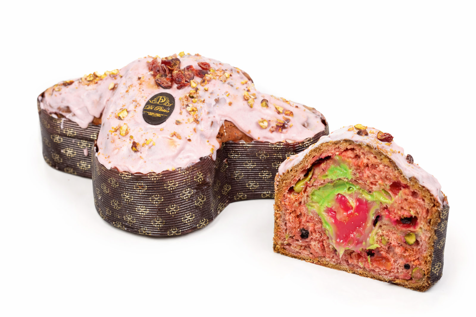 La copertura di cioccolato rosa, impreziosita da granella di pistacchio, aggiunge croccantezza e dolcezza equilibrata, completando un’esperienza multisensoriale che alterna morbidezza, cremosità e consistenza.
